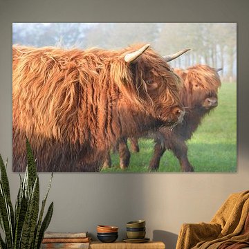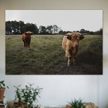 Want to buy majestic highland cow paintings, wallpaper, or photo art? The highland cow wall art collection can be printed in several high-quality materials. Think of metal, aluminium, glass, or canvas. Create calmness in the room with wallpaper from a photo of a highland cow in nature. Or buy a robust highland cow portrait on metal. There is highland cow wall art available for every style and interior.