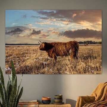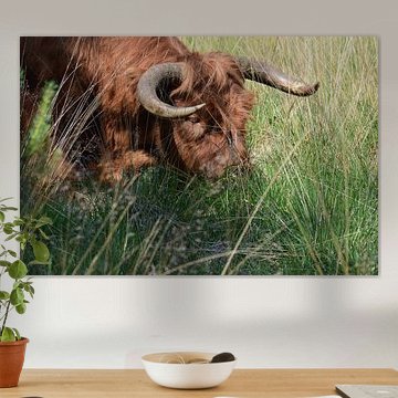 Want to buy majestic highland cow paintings, wallpaper, or photo art? The highland cow wall art collection can be printed in several high-quality materials. Think of metal, aluminium, glass, or canvas. Create calmness in the room with wallpaper from a photo of a highland cow in nature. Or buy a robust highland cow portrait on metal. There is highland cow wall art available for every style and interior.