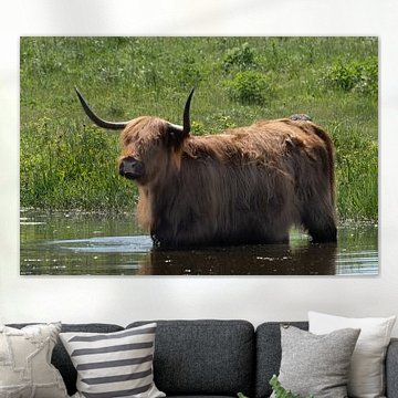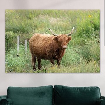 Want to buy majestic highland cow paintings, wallpaper, or photo art? The highland cow wall art collection can be printed in several high-quality materials. Think of metal, aluminium, glass, or canvas. Create calmness in the room with wallpaper from a photo of a highland cow in nature. Or buy a robust highland cow portrait on metal. There is highland cow wall art available for every style and interior.