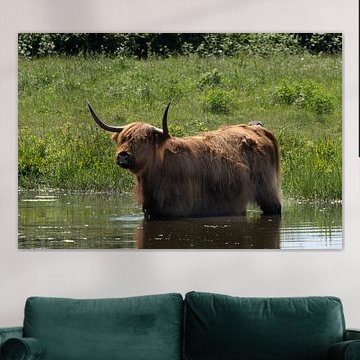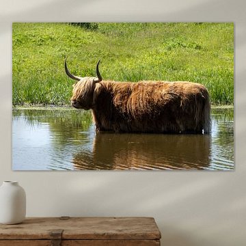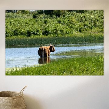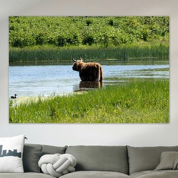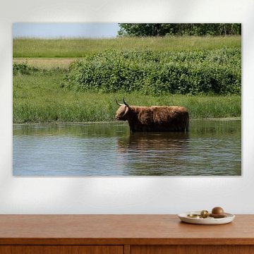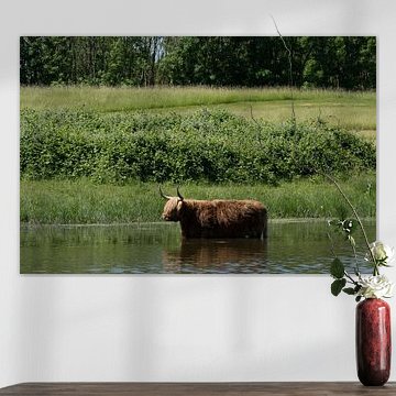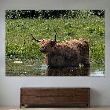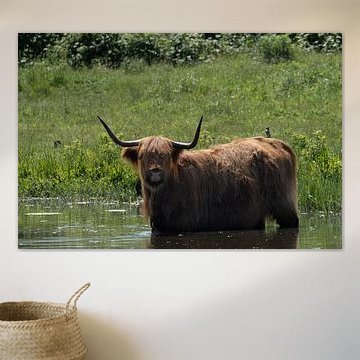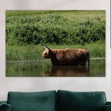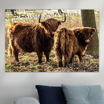 Want to buy majestic highland cow paintings, wallpaper, or photo art? The highland cow wall art collection can be printed in several high-quality materials. Think of metal, aluminium, glass, or canvas. Create calmness in the room with wallpaper from a photo of a highland cow in nature. Or buy a robust highland cow portrait on metal. There is highland cow wall art available for every style and interior.