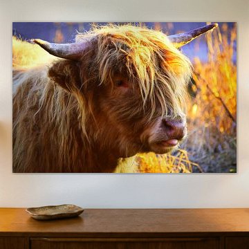 Want to buy majestic highland cow paintings, wallpaper, or photo art? The highland cow wall art collection can be printed in several high-quality materials. Think of metal, aluminium, glass, or canvas. Create calmness in the room with wallpaper from a photo of a highland cow in nature. Or buy a robust highland cow portrait on metal. There is highland cow wall art available for every style and interior.