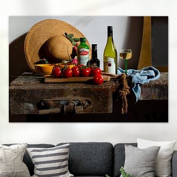 Stilleven Oude Werkbank - ateliertafel lunch met tomaten en wijn by ellenilli .