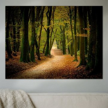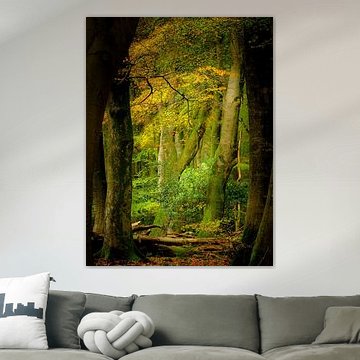 Forest imagery brings a grounded, restful quality to rooms where you unwind or concentrate. Bedrooms, home offices, and reading corners benefit from the muted greens and browns that don't demand attention. The olive and bronze tones in Wind in het bos support a peaceful atmosphere without overwhelming smaller spaces.