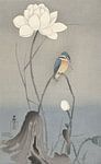 Kingfisher sitting on curved stem near white lotus flower of Ohara Koson as poster