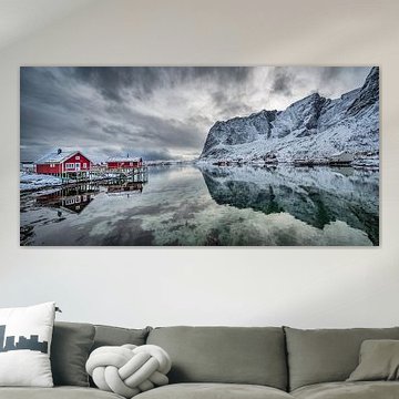 Iconic red stilt houses on the coast in the village Hamnøy on the Lofoten islands in Norway on clea by Robert Ruidl