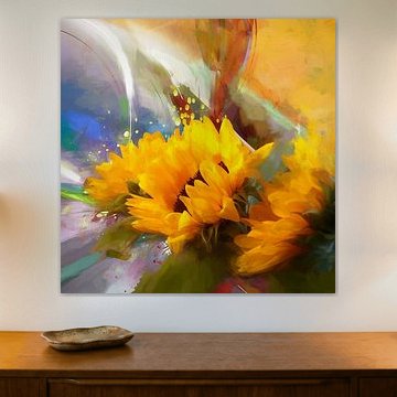 Bright sunflowers on watercolour background painting by Poster Art Shop