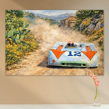 The teal and blue shades in Porsche 911 create a cool, calm backdrop that pairs beautifully with warm accent colors like brown or taupe. Try placing this artwork in a room with wooden furniture or warm textiles to create balance and visual interest in your space.