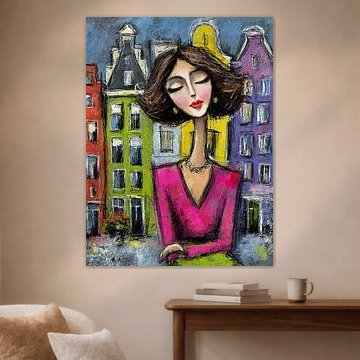The collection spans soft pastel tones and vibrant color contrasts, perfect for modern and eclectic interiors alike. Works like Trendsetter, modern portrait blend whimsy with refinement, while pieces such as Closer explore layered, dreamy compositions that draw you in.