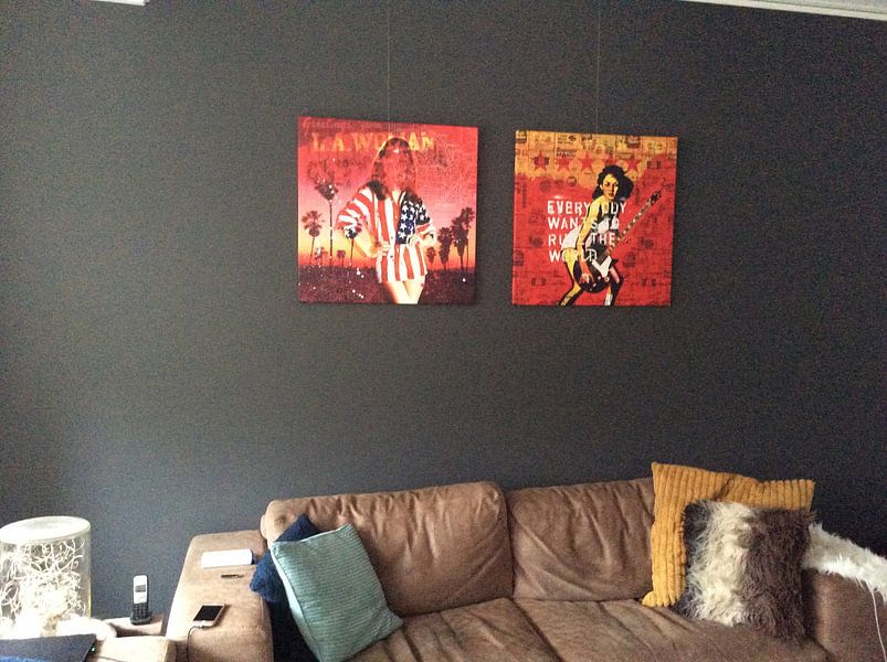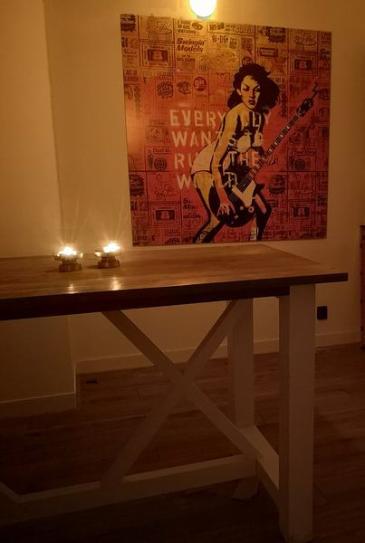Rich oranges and reds create warmth in spaces with neutral furniture or wooden accents. These tones work particularly well in living rooms or creative spaces. The vibrant red and orange palette in Everybody wants to rule the world pairs beautifully with beige sofas, natural wood, or grey textiles.