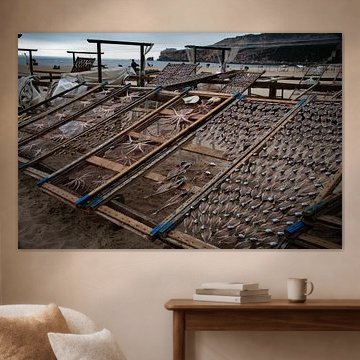 Sea animals art brings blue, teal, and brown tones that pair beautifully with coastal or Scandinavian interiors. In a Scandinavian setting, combine the cooler blues and teals with white walls and light wood furniture for a fresh, airy look. For a warmer approach, use the beige and taupe tones alongside natural materials and woven textures. The varied color palette lets you shift between vibrant fishing scenes and calm dolphin moments, depending on your mood and room.