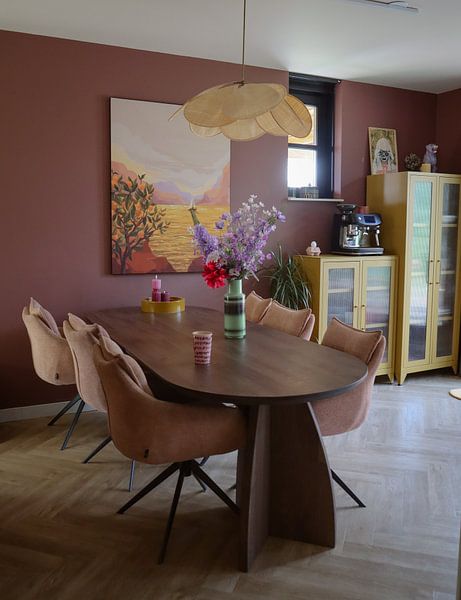 Warm bronze and taupe tones create a calm, grounded feeling in your room. The sunset palette in Into the Hills pairs beautifully with natural wood furniture, rattan accents, or terracotta accessories. Add soft textiles in cream or beige to complete the look.