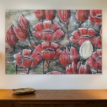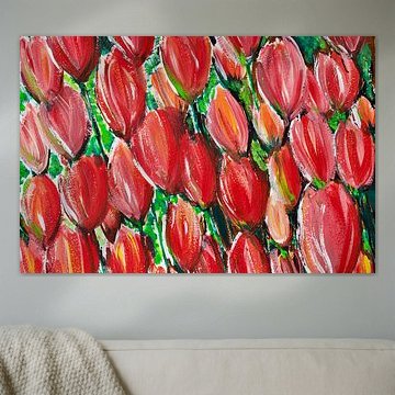 Buy a painting with tulips, and you will bring colour into your home. Wall art prints with flowers brighten up your home. Think of a tulip painting or photo art with tulips on it. If you want something slightly different, think about a modern abstract tulip painting. Want to make a big statement? Then indoor wallpaper of tulips is perfect. Or do something slightly different and buy a round tulip artwork.