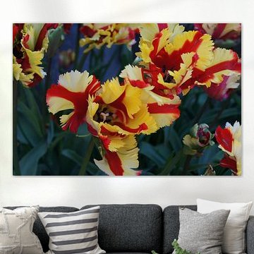 Buy a painting with tulips, and you will bring colour into your home. Wall art prints with flowers brighten up your home. Think of a tulip painting or photo art with tulips on it. If you want something slightly different, think about a modern abstract tulip painting. Want to make a big statement? Then indoor wallpaper of tulips is perfect. Or do something slightly different and buy a round tulip artwork.
