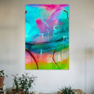 Turquoise artworks work beautifully when paired with warm beige textiles and natural wood accessories to create a balanced, inviting look. The calm and dreamy qualities of this collection make it easy to style with indoor plants - think monstera or ferns - that echo the green undertones in the palette. For a more vibrant effect, layer turquoise pieces with teal cushions or ceramic vases in complementary blue shades. Mix portrait and landscape formats to add visual rhythm and depth to your walls, creating a dynamic yet harmonious display that feels both curated and personal.
