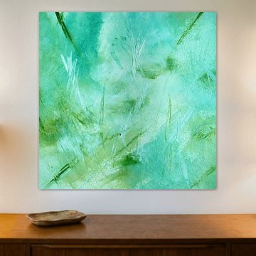 Turquoise artworks work beautifully when paired with warm beige textiles and natural wood accessories to create a balanced, inviting look. The calm and dreamy qualities of this collection make it easy to style with indoor plants - think monstera or ferns - that echo the green undertones in the palette. For a more vibrant effect, layer turquoise pieces with teal cushions or ceramic vases in complementary blue shades. Mix portrait and landscape formats to add visual rhythm and depth to your walls, creating a dynamic yet harmonious display that feels both curated and personal.