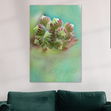 Turquoise artworks work beautifully when paired with warm beige textiles and natural wood accessories to create a balanced, inviting look. The calm and dreamy qualities of this collection make it easy to style with indoor plants - think monstera or ferns - that echo the green undertones in the palette. For a more vibrant effect, layer turquoise pieces with teal cushions or ceramic vases in complementary blue shades. Mix portrait and landscape formats to add visual rhythm and depth to your walls, creating a dynamic yet harmonious display that feels both curated and personal.
