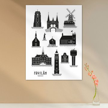 Skyline illustration province of Friesland in black-white-grey (11 stedentocht) by Mevrouw Emmer