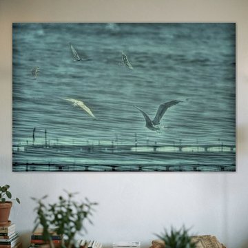 Coastal photographs with multiple visual layers - groynes, waves, distant land - add depth to flat walls. These compositions draw the eye through the scene, making smaller rooms feel more spacious. The staggered wooden posts and rolling waves in Storm echoes along Nieuwesluis create natural lines that guide your gaze and add dimension to your space.