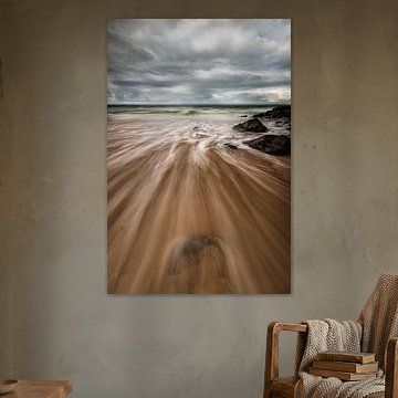 Coastal photographs with multiple visual layers - groynes, waves, distant land - add depth to flat walls. These compositions draw the eye through the scene, making smaller rooms feel more spacious. The staggered wooden posts and rolling waves in Storm echoes along Nieuwesluis create natural lines that guide your gaze and add dimension to your space.