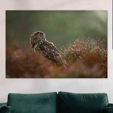 Northern Eagle Owl ( Bubo bubo ) sitting on the ground between bushes of heather, watching back, ear