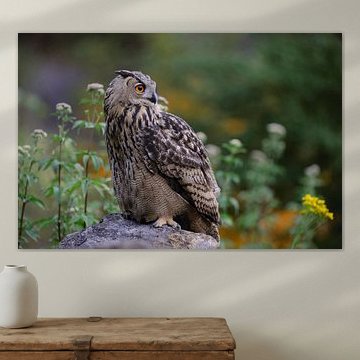 Eagle Owl ( Bubo bubo ) perched on a rock in an old querry surrounded by beautiful flowers, watching