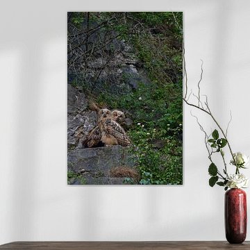 Eagle Owls ( Bubo bubo ), two juveniles sitting nect to each other in an old quarry, wachting to the