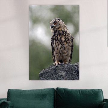 Eagle Owl ( Bubo bubo ), perched on a rock, watching aside, low point of view, wildlife, Europe.