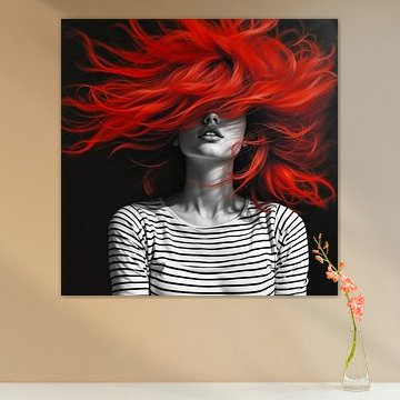Beeindruckende Fotografie Portrait von schönen Frauen mit leuchtend kraftvollen Haaren posieren in dieser Serie vor einem dezentem Hintergrund. Das Haar und Personen wirken dynamisch und voller Bewegung und bildet einen Kontrast zu dem gestreiften T-Shirts.