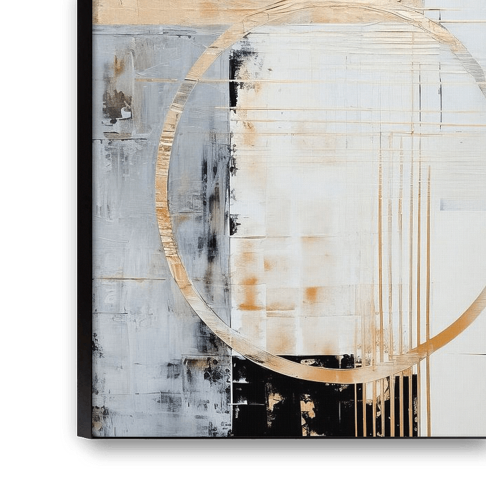 Modern art with golden geometric shapes, including circles and lines, stand out against a muted, abstract background. The design features a minimalist aesthetic with a mix of metallic sheen and soft neutral tones. This abstract painting displays a timeless and calm relaxation. The colors blend into a harmonious composition.