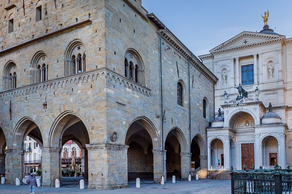 Bergamo is a picturesque city in the heart of Lombardy. Completely preserved by Venetian city walls, the Città Alta is rich in history and offers an incomparable atmosphere. Unique impression of the Piazza Duomo with the Palazzo della Ragione, Bergamo Cathedral and the Basilica of Santa Maria Maggiore.