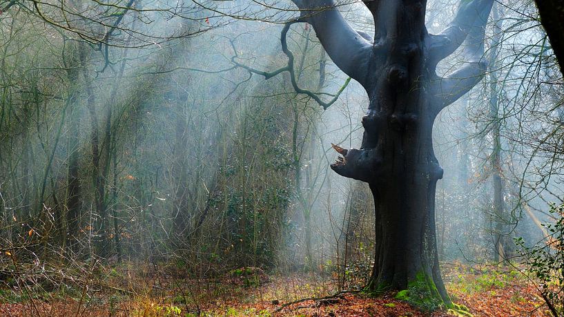In the mist, the forest giant stood, broken but not defeated. Split by time and storm, it still catches the light. When the sun breaks through the mist, the rays fall like golden strings along its weathered bark. The sun harp plays not sound, but form. Not melody, but light.