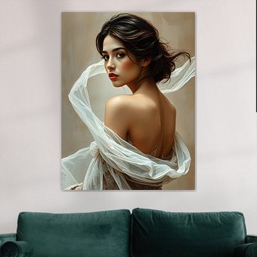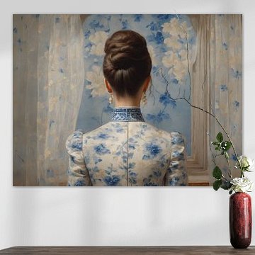 A portrait of a lady in a delft blue dress by Jolique Arte