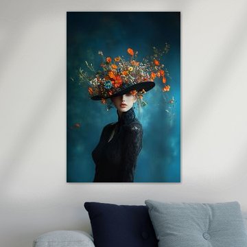 Elegance In Bloom | Woman in an elegant pose with hat and orange floral gradient, blue background by Sander van der Torren