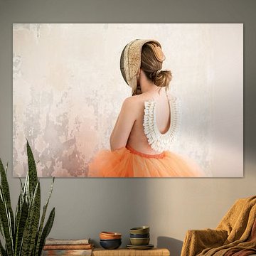 Woman in Pink Gown with Outstretched Arms Against Yellow Backgro by Markus Gann